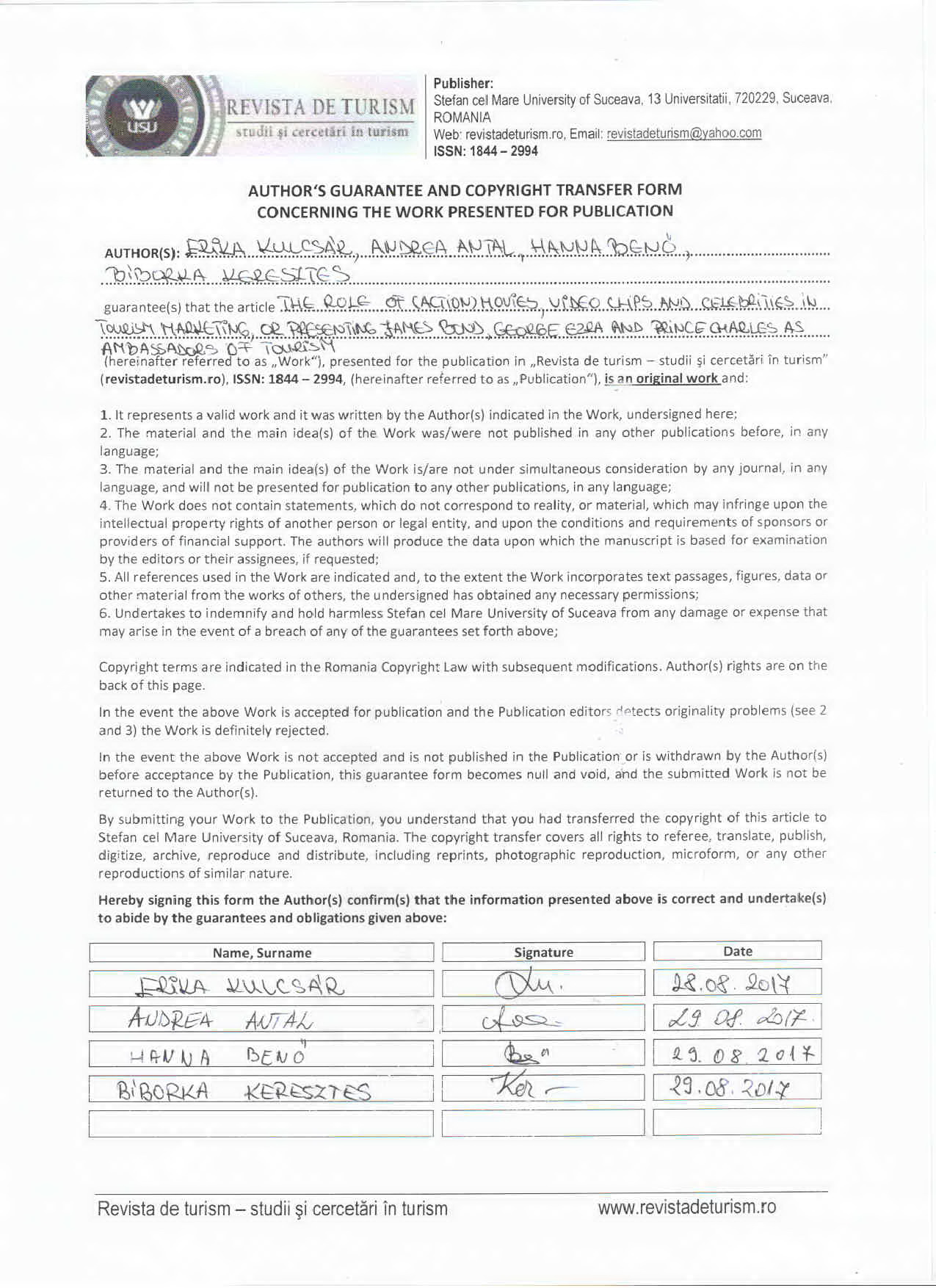 KULCSÁR, E., ANTAL, A., BENŐ, H., & KERESZTES, B. (2017). THE ROLE OF (ACTION) MOVIES, VIDEO CLIPS AND CELEBRITIES IN TOURISM MARKETING, OR PRESENTING JAMES BOND, GEORGE EZRA AND PRINCE CHARLES AS AMBASSADORS OF TOURISM. Revista De Turism - Studii și cercetări în Turism, (24). Retrieved from https://revistadeturism.ro/index.php/rdt/article/view/250