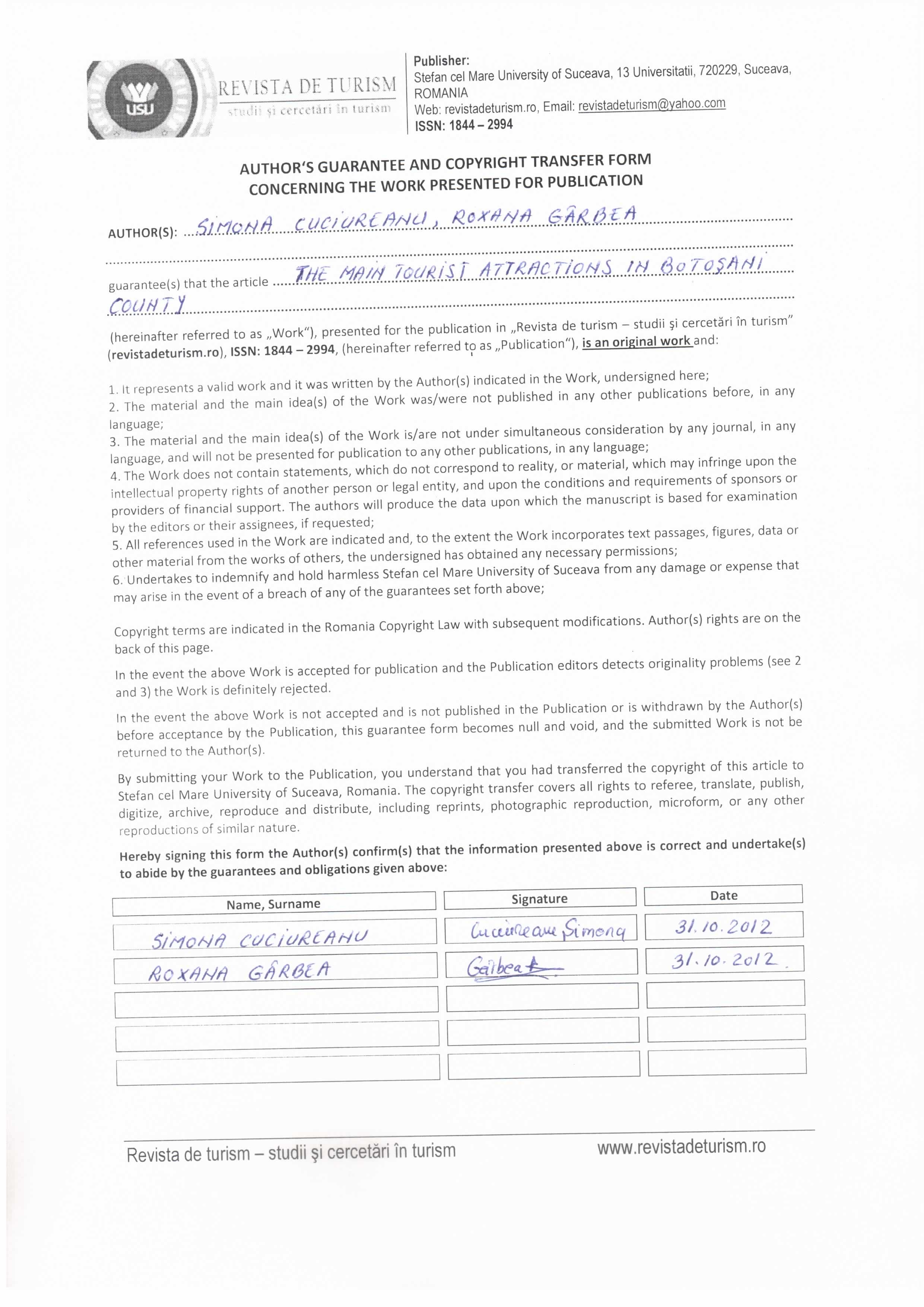 Revista de Turism: Studii si Cercetari in Turism (RDT) is an open access scholarly journal that allows free access to its content (articles, issues). RDT is available online to the readers without financial, legal, or technical barriers (no publication charges), based on the theory to keep an article's content intact. Authors can use Creative Commons licenses to specify usage rights of articles. Copyright of articles belong to authors.