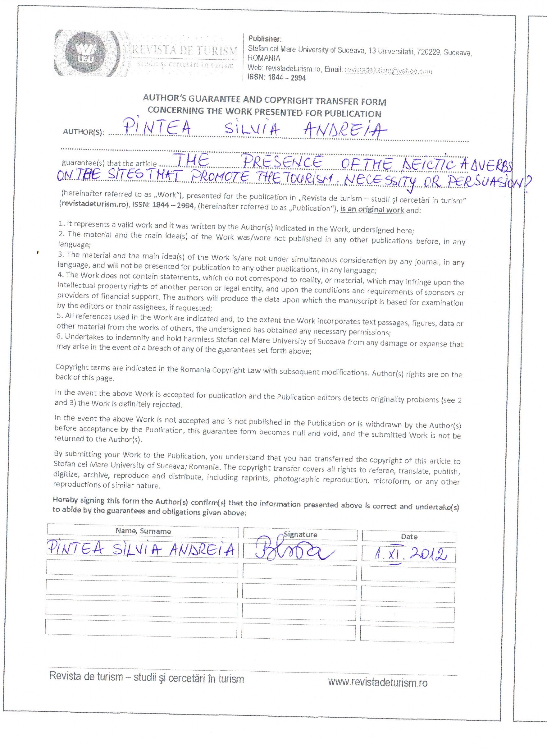 Revista de Turism: Studii si Cercetari in Turism (RDT) is an open access scholarly journal that allows free access to its content (articles, issues). RDT is available online to the readers without financial, legal, or technical barriers (no publication charges), based on the theory to keep an article's content intact. Authors can use Creative Commons licenses to specify usage rights of articles. Copyright of articles belong to authors.