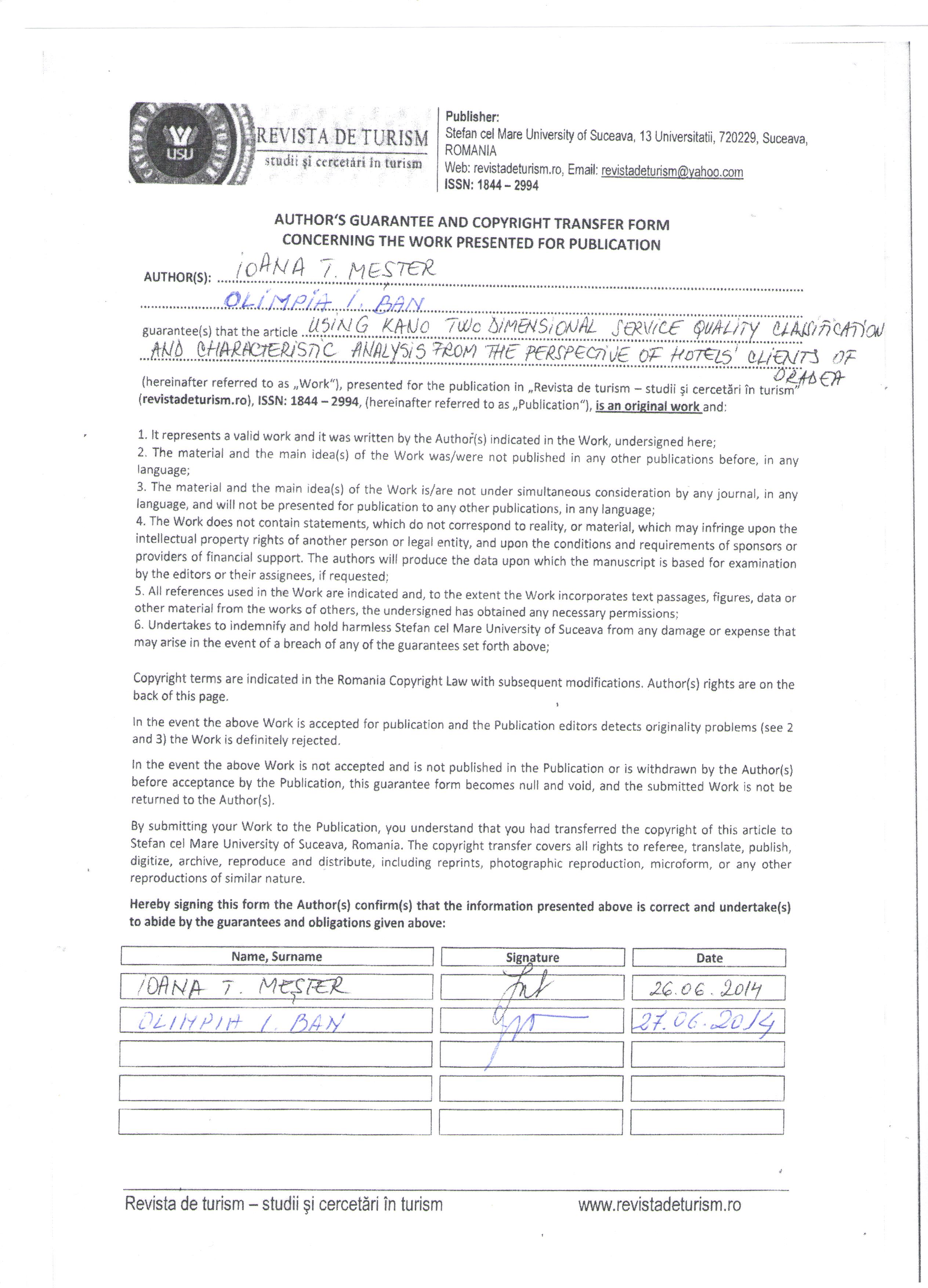 BAN, O. I., & MESTER, I. T. (2014). USING KANO TWO DIMENSIONAL SERVICE QUALITY CLASSIFICATION AND CHARACTERISTIC ANALYSIS FROM THE PERSPECTIVE OF HOTELS’ CLIENTS OF ORADEA. Revista De Turism - Studii și cercetări în Turism, (18), 30–36. Retrieved from https://revistadeturism.ro/index.php/rdt/article/view/484
